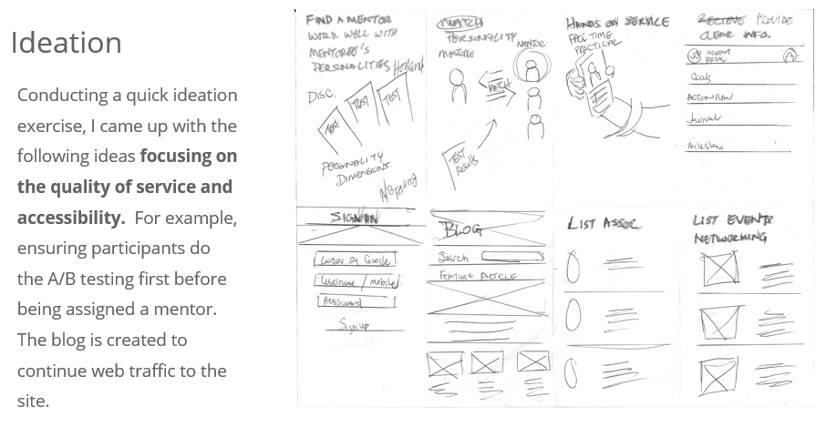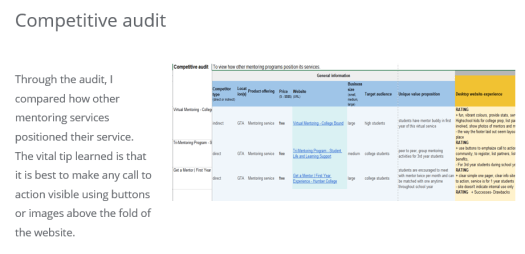 Career Mentor’s service is similar to Mentor City, a cloud service. Mentor City provides mentoring services for the Education sector, businesses, and nonprofit sectors. Not much is revealed on the website unless you signed up. The majority of mentoring services are done in-house for most post-secondary schools. The competitive audit allowed me to compare each service’s brand positioning and strategies to help with the design approach for the responsive website.