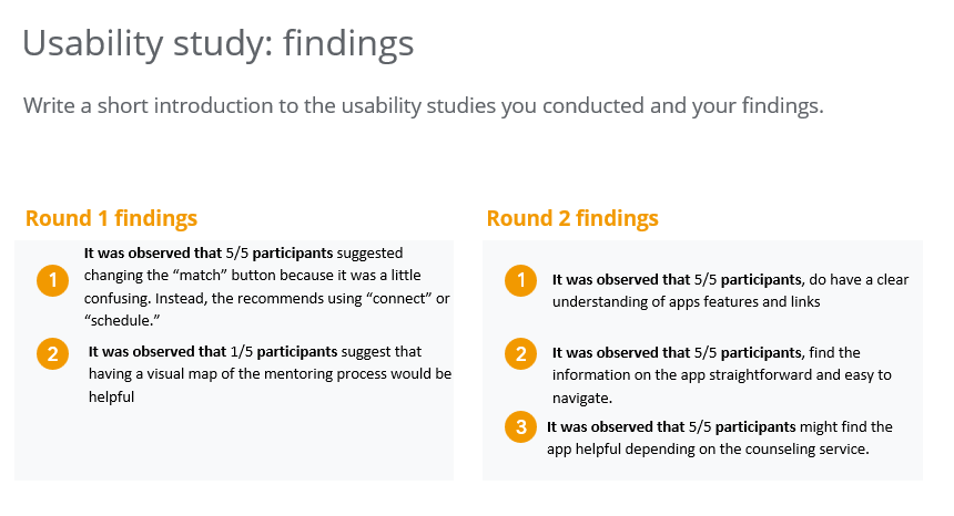 I conducted an unmoderated usability study in Toronto, Canada, on the week of February 20th. The participants were between the ages of 21-30 and 40 -50 to determine the mentorship needs of young and mature college students. The ages of the five participants are, respectively age 21, 27, 29, 45, and 50. Each session was 15-25 minutes without compensation.